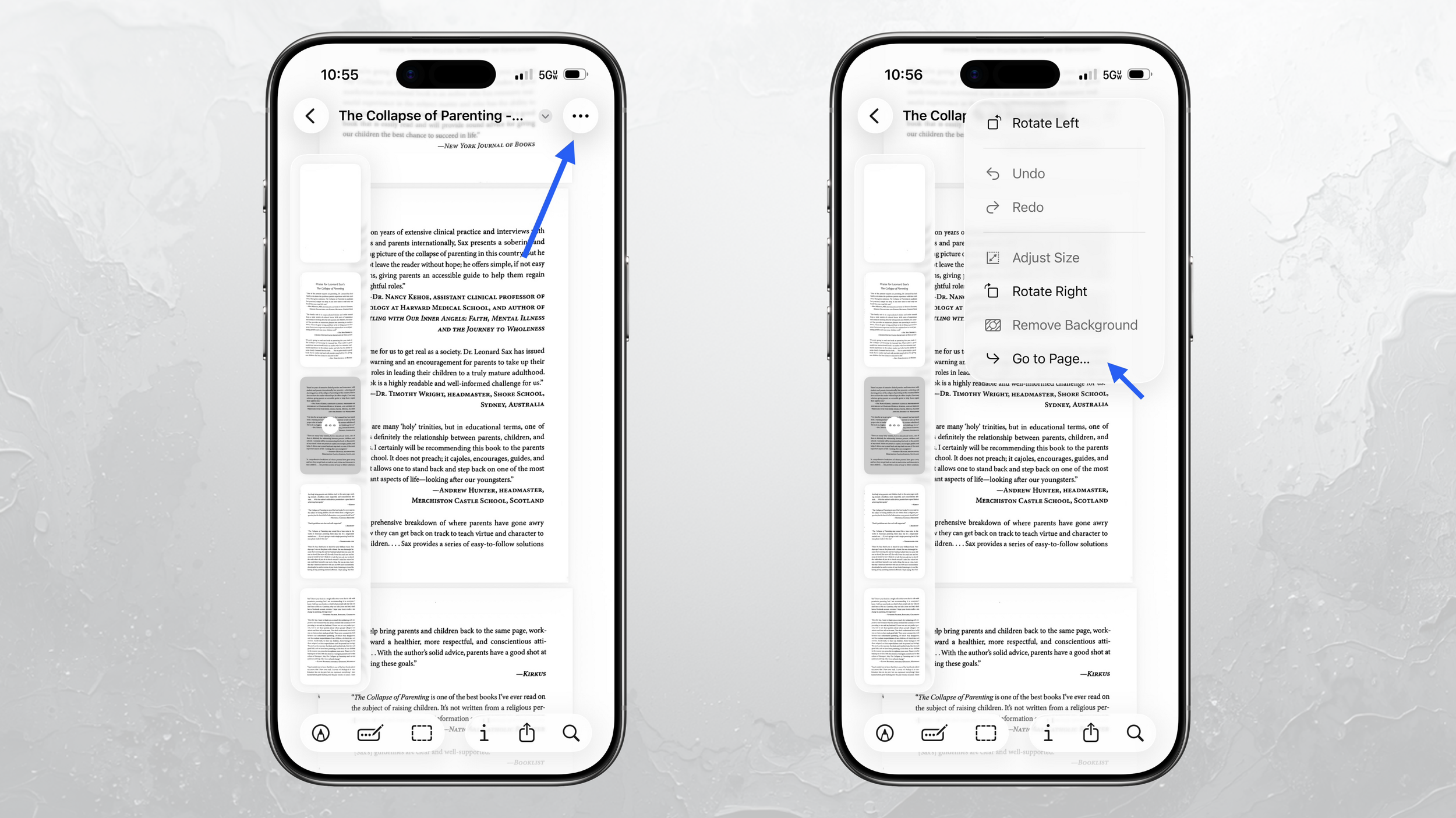 No matter which sub-menu you try, there is no “Go to page” option. You need the new Preview app in iOS 26 and then you’re allowed to go directly to a specific page number. Kind of annoying because I like scanning my books as a backup, and it’s annoying to scroll hundreds of pages down to get to a specific page.
