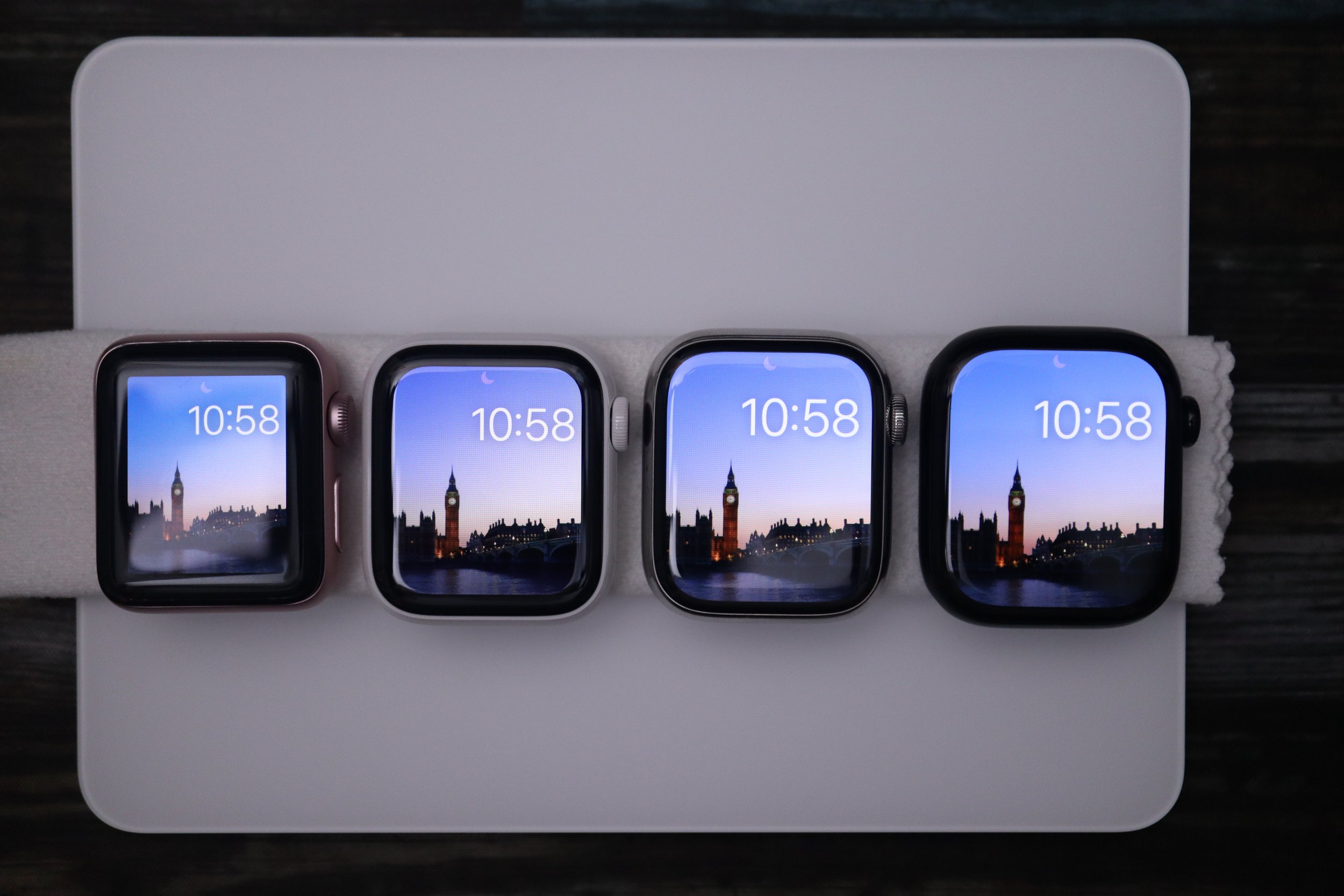 The Series 3 bezels are ancient (far left), making the Series 5 (2nd from left) more acceptable. The Series 10 (far right) looks like it has a bigger bezel than the Series 9 to its left, but it’s actually more complicated.