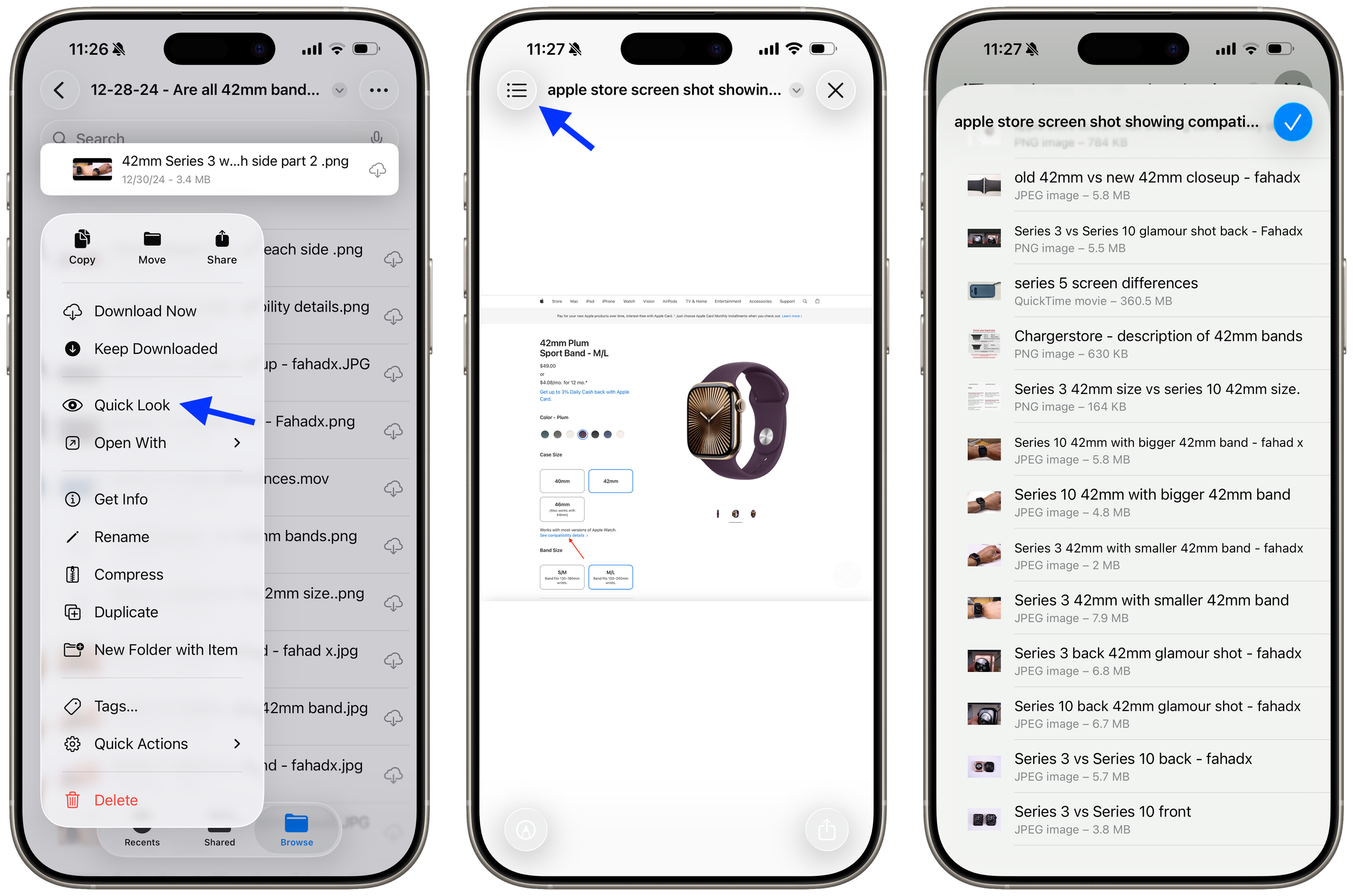 You need to click and hold on a file, in the menu that pops up you select Quick Look. Then you can swipe between files. You will also get a pull down menu to the left, where you can choose between the files in the selected folder.